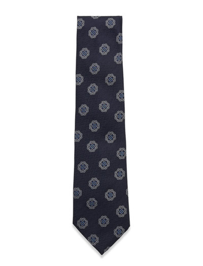 Gewebte Strukturen und ein sich wiederholendes Motiv definieren diese elegante Krawatte. Das dezente Muster sorgt für visuelles Interesse, ohne zu aufdringlich zu sein, was sie zu einer vielseitigen Ergänzung für jede formelle oder Business-Garderobe macht.