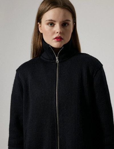 Diese Strickjacke mit Reißverschluss ist aus recycelten Fasern gefertigt und verfügt über ein warmes, strukturiertes, schweres Rippstrickgewebe. Ein hoher Trichterkragen und ein durchgehender Zwei-Wege-Reißverschluss vorne tragen zu ihrer Attraktivität bei. Die lockere Passform und die langen Ärmel sorgen für Komfort, während die Seitentaschen die Funktionalität erhöhen. Klare Linien vervollständigen dieses mühelos kombinierbare Kleidungsstück.