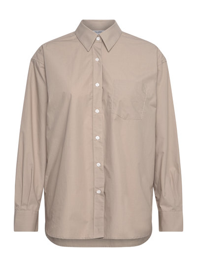 Oversized shirt in organic cotton poplin with silky finish. Neat collar, front buttoning, buttoned c.uffs, and single patch pocket..