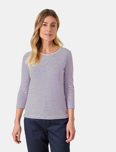 Dieses gestreifte T-Shirt von Gerry Weber ist ein klassisches Kleidungsstück für jede Garderobe. Es hat eine bequeme Passform und ein zeitloses Design. Die Dreiviertelärmel sorgen für einen stilvollen Look, während der runde Halsausschnitt einen Hauch von Eleganz verleiht.