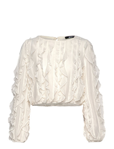 Diese Gina Tricot Bluse hat zarte Rüschen. Die Rüschen verleihen ihr einen Hauch von Eleganz. Sie hat lange Ärmel und eine bequeme Passform. Ein vielseitiges Kleidungsstück für jeden Anlass.