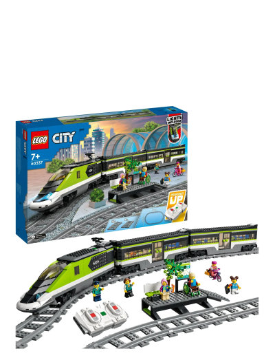 Das LEGO® City Express Personenzug-Set (60337) enthält eine ferngesteuerte Hochgeschwindigkeitslokomotive mit funktionierenden, dimmbaren Scheinwerfern und LEGO Powered Up Technologie, einen Speisewagen, einen Personenwagen, einen Bahnsteig, 24 Gleisteile und 6 Minifiguren für stundenlanges Rollenspiel mit dem Zug.