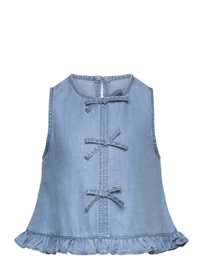 Diese ärmellose Bluse hat ein charmantes Design. Sie hat einen runden Halsausschnitt und dekorative Schleifen. Die Bluse ist aus einem weichen und bequemen Material gefertigt. Ein gekräuselter Saum verleiht ihr einen Hauch von Eleganz.