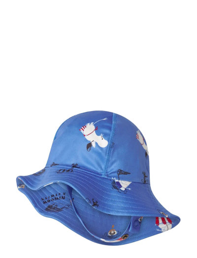 Swim hat with a wide brim that is longer at the back. The hat closes with a strap with a button closure in two adjustable lengths.