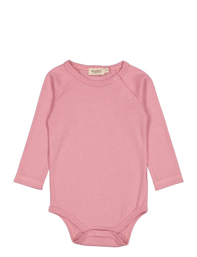 Plain long-sleeved bodysuit with raglan sleeves, with snap buttons in front of the left shoulder and at the crotch for easy changing.