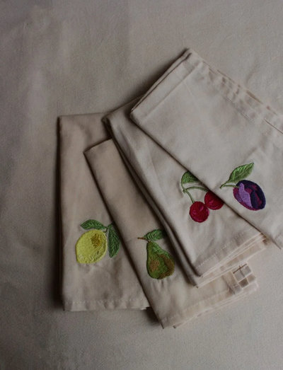 They feature with four individual fruit embroideries, a pear, a lemon, a cherry and a plum on a beige base.