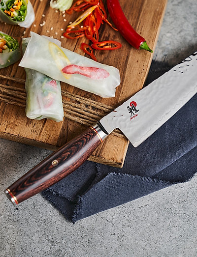 UniversalMiyabi celebrates japanese craftsmanship with artisan. using traditional methods and innovative techniques, these knives merge the past and present into an exceptional knife collection. the potent core of sg2 microcarbide powder steel is layered in a tsuchime finish. this exquisite, handhammered effect helps prevent food from sticking. each knife features a handhoned blade finished with a true katana edge, a homage to the samurai swords made in seki centuries ago. fabricated with special cocobolo rosewood pakkawood, the handles mirror the beauty of the blade. sophisticated details include brass and red spacers, a mosaic pin and a stainless steel end cap. the attractive dshaped handle is designed to nestle comfortably in your hand for tireless cutting. handcrafted in seki, japan.