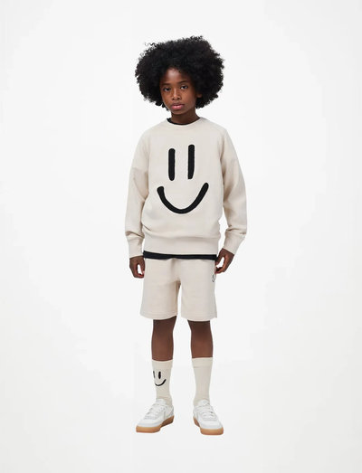 Soft cotton jersey shorts designed for comfort and style. Featuring a clean, relaxed look, they include side pockets, a back pocket, and a charming embroidered smiley face at the front. The elastic waistband adjusts with a drawstring for a secure fit, making them perfect for everyday play and adventures. Ideal for warm weather, these shorts will be a favorite in any child's wardrobe.