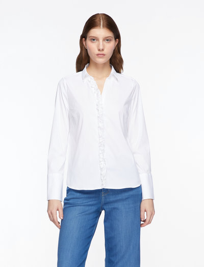Stunning shirt designed in a regular silhouette with a flattering V-neck, ending in classic button closure. It's finished with long buttoned cuffs and cool frill details at the front. Wear it with jeans or tailoring, depending on the occasion.