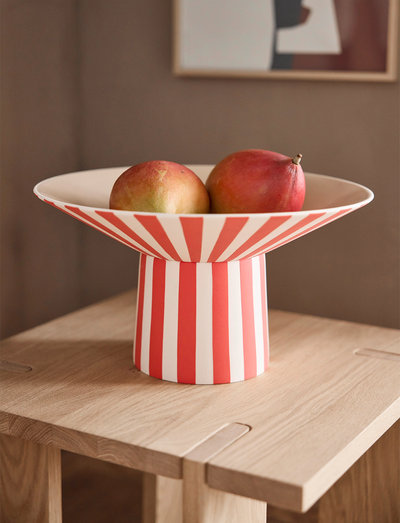 The toppu centerpiece with a splash of color is a handpainted, sculptural piece that makes a bold statement on any table. featuring vibrant stripes, it adds a playful touch to any space. perfect for organizing small items or serving snacks, it also serves as a unique art piece.