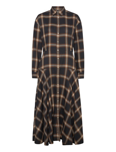 Dieses Hemdkleid ist aus Left-Hand-Twill mit einem Allover-Karomuster gefertigt. Die Konstruktion mit Einsätzen sorgt für eine unverwechselbare Silhouette, die ein locker sitzendes Oberteil mit einem weit schwingenden A-Linien-Rock kombiniert. Es ist so konzipiert, dass es oberhalb des Knöchels endet, und verfügt über einen gespreizten Kragen und eine Knopfleiste mit Knöpfen aus Schale.