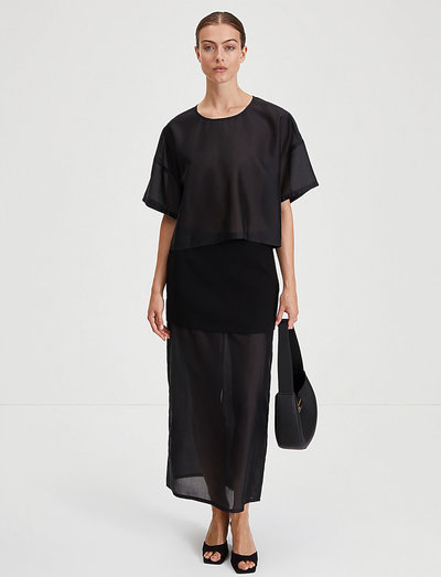 Das Berra Top ist ein transparentes, locker sitzendes Oberteil mit einer kastenförmigen Silhouette. Es hat einen Rundhalsausschnitt und kurze, weite Ärmel.
