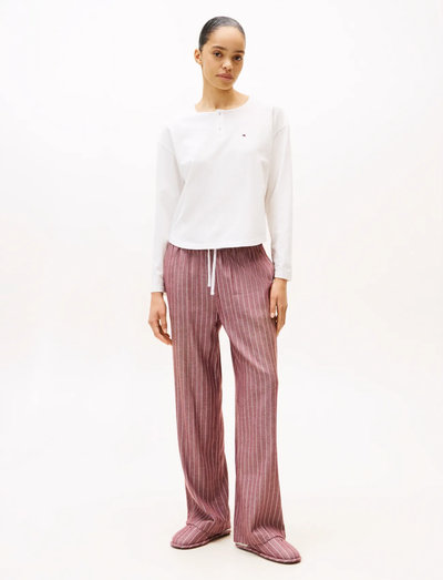 Dieses Pyjama-Set bietet eine bequeme und stilvolle Option für die Nacht. Das langärmlige Oberteil verfügt über eine Knopfleiste, während die gestreifte Hose einen elastischen Bund für eine flexible Passform hat. Perfekt zum Entspannen oder für eine erholsame Nachtruhe.