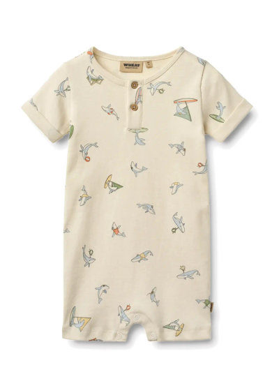 Printed jumpsuit with short-sleeves and legs in soft organic cotton for babies.- Placket at the front with two buttons- Rolled up sleeve hems- Press buttons along the inseam of the legs- Wheat signature printWheat's jumpsuits for babies are both cute and comfortable. The jumpsuits either have press buttons at the shoulder or at the front for better comfort, when you are dressing your baby. The jumpsuit also has press buttons along the inseam of the legs, which makes it easier for you to access your babys diaper. The jumpsuit can be worn on its own or as an extra layer underneath everyday clothing.---- Standard 100 by OEKO-TEX®- 100% Organic cotton- The product is GOTS certified