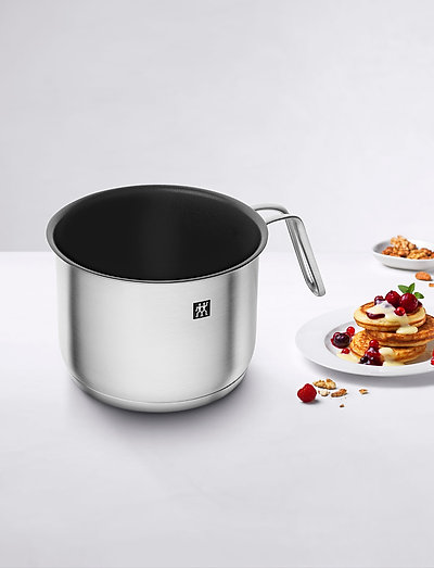 The coated milk pot from the zwilling pico series has a diameter of 14 cm . the small pot takes up little space in the cupboard ideal for small kitchens with limited storage space. the duraslide ultra nonstick coating ensures that nothing burns. the sigma classic sandwich base has an aluminum core so that the simmer pot heats up evenly. in addition, highquality 18/10 stainless steel was used. the surface is very robust and scratchresistant. the pot can be used on all common stove types including induction. whenever you want to warm up a small portion, the milk pot is a good idea. and it is also ideal for fine sauces.