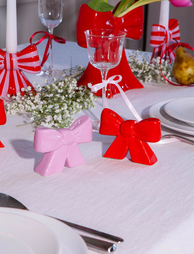 Ceramic salt and pepper shakers shaped as bows, taking inspiration from the ethereal ballet world and the whimsical allure of coquetry.
