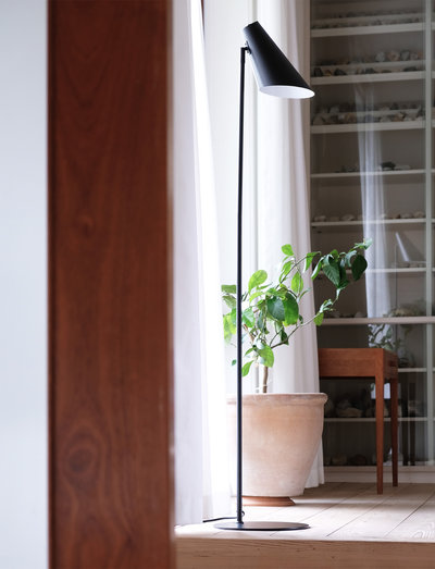 Die elegante Optik und das minimalistische Design machen Cale zu einer attraktiven Leuchte sowohl für den Bürobereich als auch für den Wohnbereich. Neben der Stehleuchte besteht die Serie auch aus einer Wand- und Tischleuchte. Erhältlich wie hier in mattschwarzem Metall und in weißem Metall. Der Leuchtenkopf kann in die gewünschte Richtung gedreht werden. Der Schalter befindet sich an der Oberseite des Leuchtenkopfes. Die Leuchte wird mit einer 1,8 m langen schwarzen Stoffschnur geliefert.