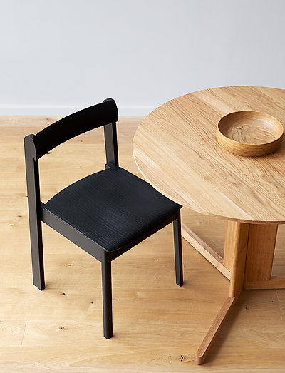 A center point of free floating solid oak elements holds the round table and creates a contradiction of lightness and a substantially dense round table. The free space of the three legs adds to the lightness and special visual complexity of the table.
