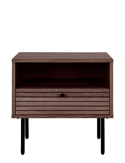 Side table, 1 drawer, oak veneer, smoked, black metal legs 50x40x50 cm