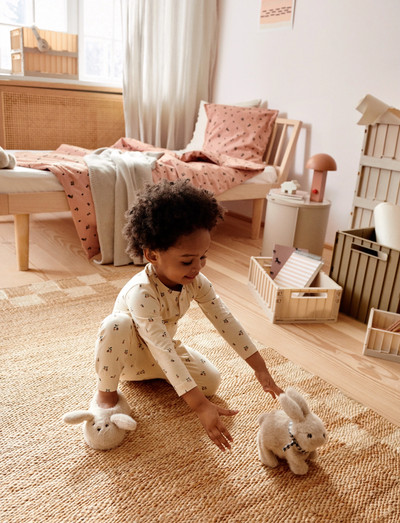 Crafted from a slightly thicker cotton, this pyjama jumpsuit is incredibly soft and breathable. Perfect for bedtime routines or relaxed mornings, it ensures a comfortable fit for both sleep and play. The playful print adds a touch of fun.