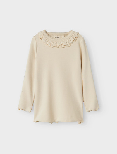 Featuring a charming ruffled neckline, this long-sleeved top offers a touch of elegance. The design is completed with delicate trim at the cuffs.