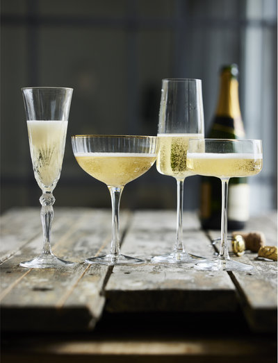 The champagne glass showcases its bubbling contents in the most beautiful way when the elegant pattern reflects the shadows of the surroundings. 4 glasses, 16 cl. h 22 cm.production of the beautiful glass range is carbon neutral. only the purest raw materials are used in production, processed solely by energy from solar cells and geothermal energy, with zero pollutants emitted. the result is ultraclear, recyclable ecocrystal glass that is both durable and dishwasher safe.