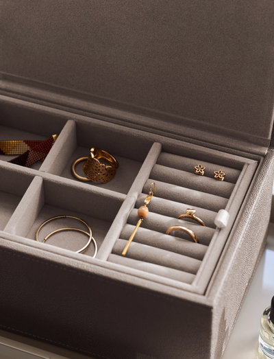 This jewelry box offers ample storage. It features a lift-out tray for rings and earrings. The main compartment is perfect for necklaces and bracelets. A sophisticated design complements any dresser.