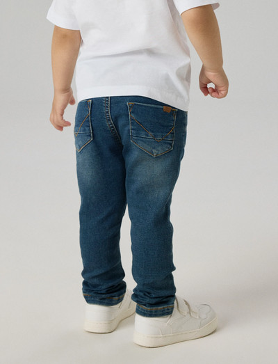 Regular fitCrafted from denim, these slim-fit jeans offer a timeless style and freedom to move. These jogger-style jeans feature front and back pockets, subtle abrasions, and an adjustable, elasticated waist for a comfortable fit. They have a fixed cord and come with a press stud and mock fly fastening for sizes 80-110, or a hook button and zip fly fastening for sizes 116-164.