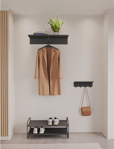 A blissful union of minimalism and functionality. The shoe rack is the same width as the coat rack and can be conveniently placed underneath. It’s easy to move, and consists of two large shelves with room for a total of six pairs of shoes as well as flat sandals and slippers underneath. The shoe rack is extremely stable, but with open ends and almost floating shelves to lift the look. Made of powder-coated steel.
