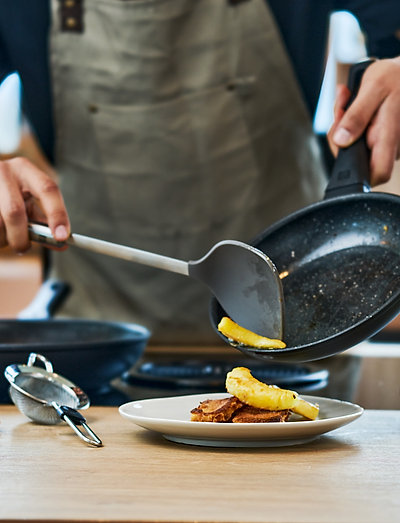 Cooking with a wok is twice the fun with the zwilling pro series silicone wok turner. it is ideal for stirfrying in the typical wok cooking fashion, whereby fresh ingredients are only briefly fried while they are tossed and turned. the turner is easy to handle thanks to the ergonomically designed, satinfinish stem. the front part is made of heatresistant silicone that prevents scratching on nonstick surface woks. this allows you cook energetically without fear of damaging the surface. the loop in the attractive handle also allows you to hang the turner on a kitchen rail to save space. this not only means that you always have your wok turner to hand, it also adds a design effect to your kitchen. after all, internationally known designers matteo thun and antonio rodriguez have focused on both – absolute functionality and exceptional, timeless design in their work. together with other pro series kitchen gadgets, it creates a uniform, minimalistic look that enriches any kitchen design. the seamlessly designed wok turner is made of satinfinish stainless steel and is suitable for use in the dishwasher.