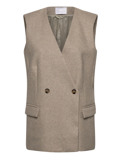 Denne ærmeløse blazer er en tidløs tilføjelse til enhver garderobe og har et dobbeltradet design og et subtilt sildebensmønster. Den skræddersyede silhuet og de klassiske revers tilføjer et strejf af elegance, hvilket gør den perfekt til lagdeling eller til at bære alene.
