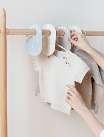 Smart wardrobe dividers for organizing your child's new and inherited clothes in the wardrobe. The set comes with 8 wardrobe dividers labeled with age on both sides.
