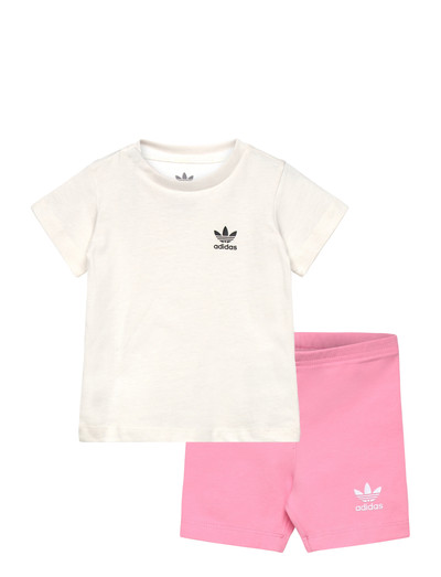Dette sæt inkluderer en t-shirt med korte ærmer og shorts. T-shirten har en klassisk rund hals og et lille adidas-logo på brystet. Shortsene har en elastisk talje og et lille adidas-logo på benet.