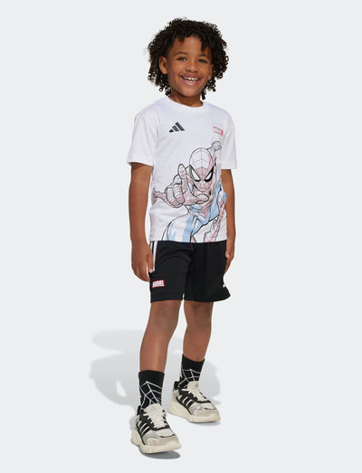 Dette sæt indeholder en t-shirt med korte ærmer og shorts. T-shirten har et grafisk print af Spiderman, og shortsene har tre hvide striber på siderne. Sættet er perfekt til hverdagsbrug.