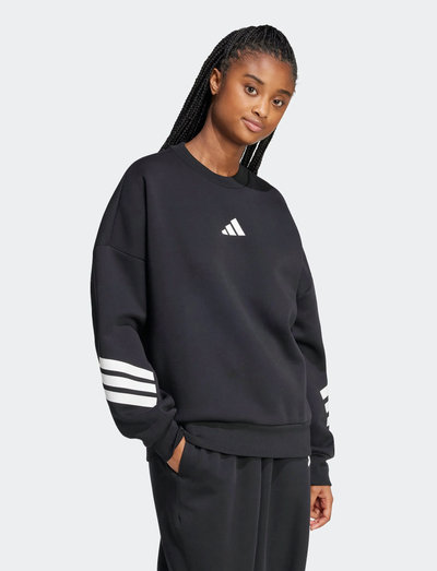 Denne sweatshirt er lavet af en blanding af genanvendt polyester og bomuld. Den har en løs pasform og en klassisk rund hals. Sweatshirt'en har et lille adidas-logo på brystet og tre hvide striber på ærmerne. Den er perfekt til hverdagsbrug eller til træning.