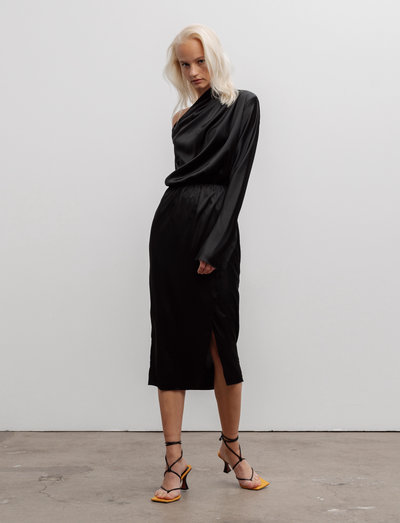 Cho-kjolen er et stilfuldt og elegant stykke tøj. Den er lavet af en blanding af acetat, polyester og spandex, hvilket giver den en blød og behagelig fornemmelse. Kjolen har et off-shoulder design med placerede folder til draperinger langs halsudskæringen. Den har også en elastisk talje og en slids i nederdelen og i bunden af ærmerne.