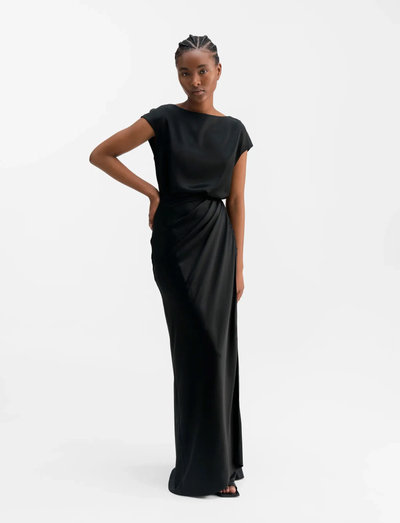Denne kjole er fremstillet af en glat acetatblanding med en diskret glans og har en flatterende bådhals og korte ærmer. Sarong-nederdelen bindes i taljen, hvilket giver en justerbar pasform. Plisserede detaljer i taljebåndet fremhæver det elegante fald, hvilket gør den ideel til særlige lejligheder.