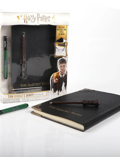 Tom Riddles dagbog var usynligt fyldt med Toms hemmeligheder og minder. Nu kan bogen fyldes med dine! Den medfølgende pen er fyldt med usynlig blæk, der kun kan ses under tryllestavens UV-lys. Dette sikrer, at de magiske egenskaber er tro mod filmen. Alt du skal gøre, er at føre spidsen af staven hen over siderne, så vil det, du har skrevet, blive afsløret på magisk vis! Dagbogen er med smuk, læderagtig indbinding (ikke ægte læder) med beskyttelseshjørner i patineret metal. Bruger 3 x 1,5V LR41/AG3 batterier (inkluderet). Fra 8 år.