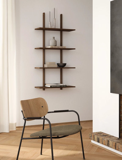 Hylden er perfekt til udstilling af bøger, små planter eller kunstobjekter – og fungerer lige godt alene eller som del af en større hyldevæg. Det enkle formsprog gør den velegnet til både moderne og nordisk indretning. Den vertikale ryg giver hylden karakter og stabilitet, mens hylderne skaber opbevaringsplads til udstilling af personlige genstande.