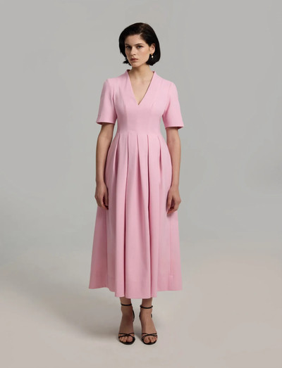 Denne midikjole er fremstillet i en blød bomuldsblanding og har en flatterende A-linjeform med elegante plisseringer. Designet har et figursyet liv, korte ærmer, en V-udskæring og praktiske, skjulte lommer. En åbning med en knap i nakken og en lynlåslukning i siden fuldender designet.