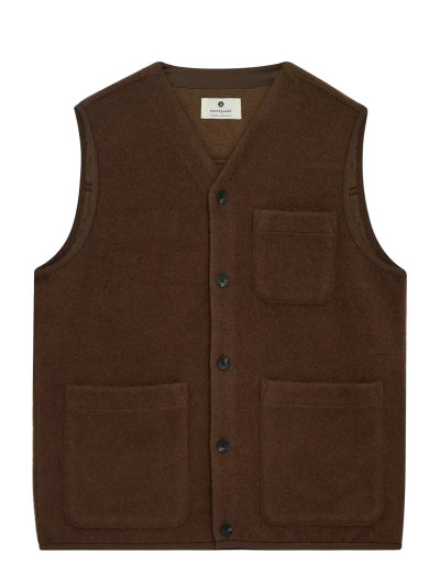 Denne vest er fremstillet af kogt uld og giver et tekstureret look og en behagelig fornemmelse. Med en knaplukning foran og praktiske påsyede lommer er den et alsidigt lag-på-lag-stykke til køligere dage.