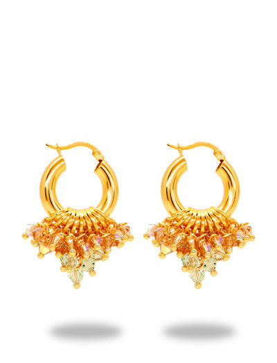 Disse øreringe har en guldhængsel med en delikat klynge af krystaller, der hænger fra bunden. Krystallerne er en blanding af klare og iriserende farver, der tilføjer et strejf af glans til ethvert outfit.