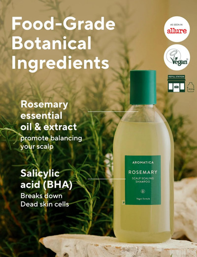 Aromatica Rosemary Scalp Scaling Shampoo renser dybt og fjerner ophobninger fra hovedbunden, samtidig med at den bevarer fugtigheden. Den er beriget med rosmarin-, cedertræ- og ingefærolier, fremmer sund hårvækst og lindrer kløe.