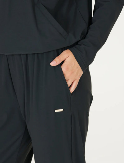 Stretch pants in moisture wicking fabric with anti static treatment and adjustable waist and leg-end. Gold logo badge.