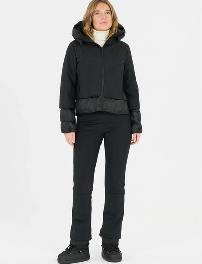 Softshell pants with 4-way stretch, micro polar fleece back side, wide elastic waistband, elastic logo detailed snow gaitors, zippered hems and gold logo badge.