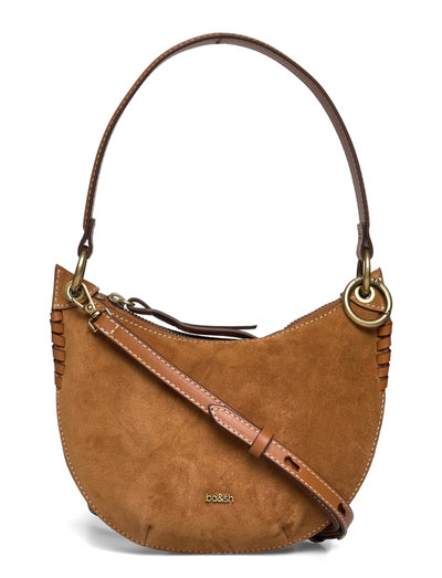 Denne swingtaske er fremstillet af blødt ruskind og har en karakteristisk halvmåneform. Designet omfatter et tophåndtag og en aftagelig skulderrem, der giver alsidige bæremuligheder. Dekorative syninger langs kanterne tilføjer et strejf af håndværksmæssig detalje.