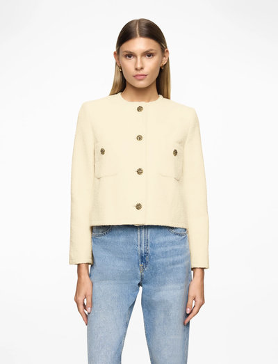 MEREDITH JACKET er en stilfuld og alsidig jakke. Den har et klassisk design med rund halsudskæring, lange ærmer og knaplukning. Jakken er lavet af en blød og behagelig blanding af bomuld, uld og polyamid. Den er perfekt til at lagdele over dine yndlingsoutfits og tilføje et strejf af sofistikering til dit look.