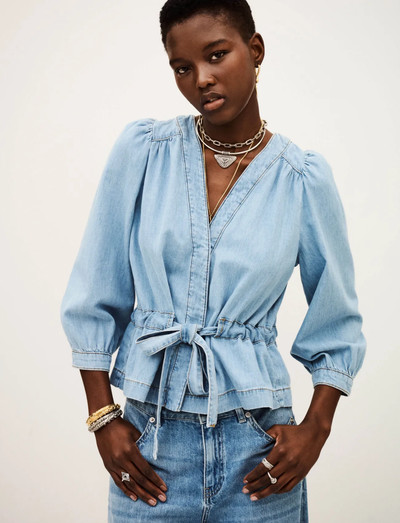 Denne langærmede top har en flatterende slå-om-silhuet og er indsnævret i taljen med et bindebælte. Peplum-kanten tilføjer et feminint touch, mens V-udskæringen fremhæver décolleté.