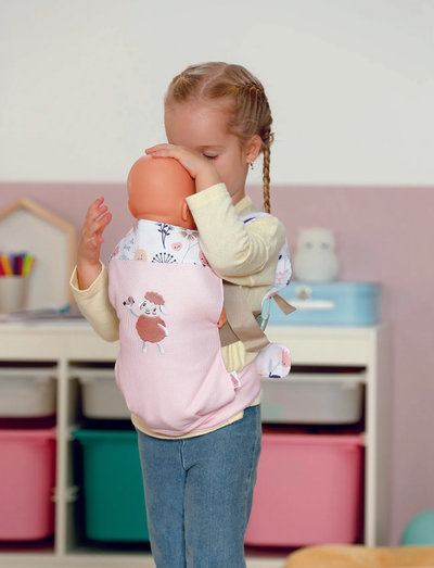 Denne komfortable dukkebæresele i sart pink med blomsterprint gør det muligt at bære 36 cm og 43 cm høje dukker sikkert – enten vendt fremad eller ind mod dukkeforældrene. De justerbare seler sikrer en behagelig pasform, så bæreselen nemt kan tilpasses barnets størrelse.