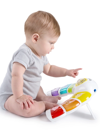 Store hjerner starter i det små. Farver, dyr, lys og melodier er lige ved babys fingerspidser under mavetid eller siddende leg! Gør mavetiden sjov og engagerende med det berigende indhold i Baby Einsteins Glow & Discover Light Bar. Legetøjsstangen lyser op, når baby rører ved de farverige sektioner eller drejer rangletrommen. Stimulér babys lydsans med tre forskellige tilstande, herunder dyrelyde, farver og xylofonlyde. Vælg mellem engelsk, spansk eller fransk, alt sammen tilgængeligt i ét stykke legetøj! Legetøjsstangen kan lægges fladt ned, når barnet ligger på maven, og den kan hæves, når barnet sidder ned og leger. Når legen er slut, kan legetøjsstangen klappes sammen, så den er perfekt til opbevaring og transport. Perfekt til babyer fra 3 måneder og opefter.
